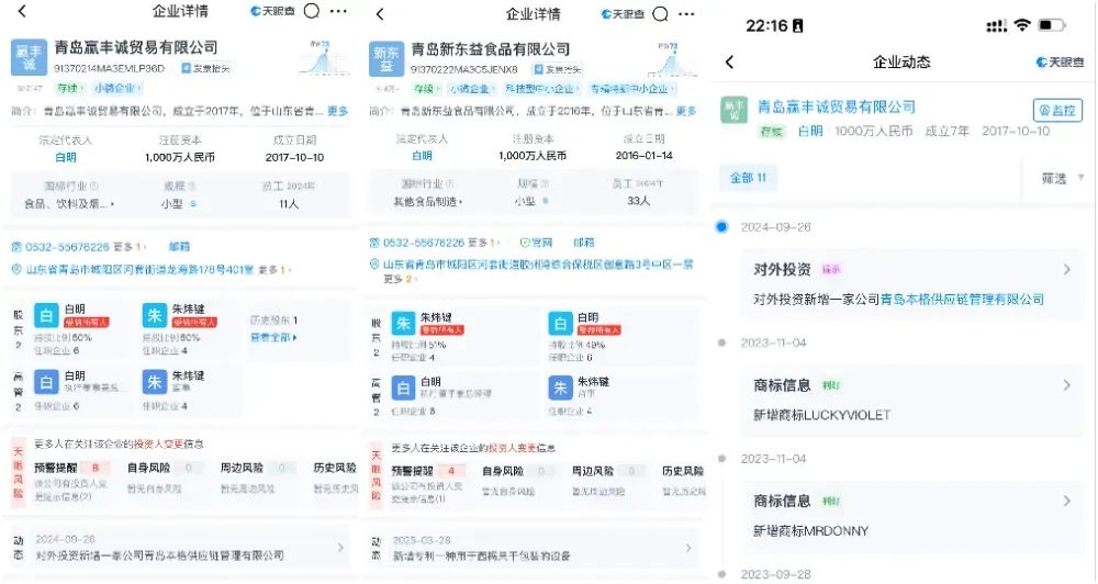 從生產(chǎn)信息來(lái)看,這款品牌名為MRDONNY的西梅干的生產(chǎn)商為“青島贏豐誠(chéng)貿(mào)易有限公司”,而這家公司又委托給“青島新東益食品有限公司”生產(chǎn)。天眼查顯示,這兩家公司實(shí)為關(guān)聯(lián)公司,股東相同。而MRDONNY是“青島贏豐誠(chéng)貿(mào)易有限公司”在2023年11月申請(qǐng)的商標(biāo),這也是山姆線上這款西梅干的時(shí)間。