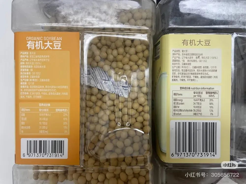 山姆Member’s Mark有機(jī)大豆新舊兩版對(duì)比圖(左為新版,右為舊版),圖片來(lái)源:小紅書@果凍