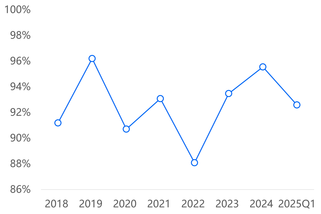 二是在2025年Q1期末出租率拔升到96.26%的情況下,整個季度的平均出租率仍只有92.59%,也就是說1或2月的出租率并不好看,大概率比2024年末的92.54%還要低。