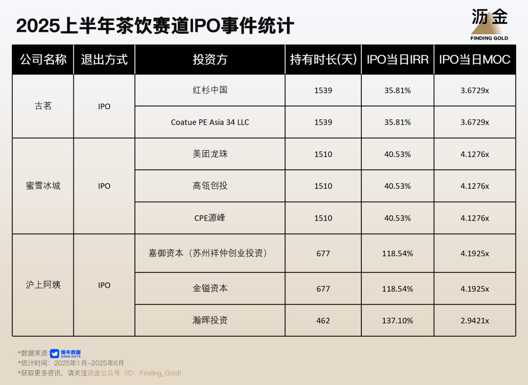 古茗、蜜雪冰城、滬上阿姨順利實現(xiàn)IPO,這三家品牌的IRR(投資的年化收益率)也十分理想,分別達到了35.8%、40.5%和137.1%。