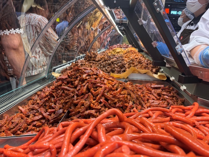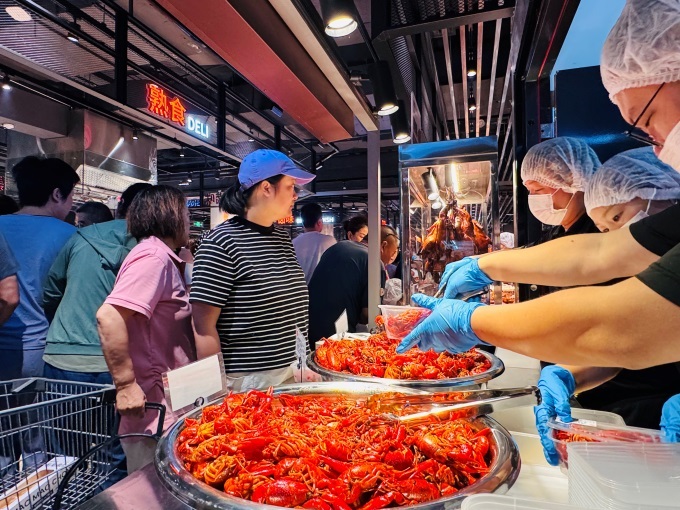 熟食區(qū)煙火氣十足,不僅匯集了胖東來(lái)同款豬蹄、小甜腸、炸雞,還有門店現(xiàn)烤烤鴨、手工鮮包、現(xiàn)制豆?jié){豆腐、多口味小龍蝦、特色拌菜、撈汁小海鮮等,也深度融入本地特色,保留并強(qiáng)化了方肉、碗坨等本地特色,滿足家庭餐桌的便捷與多樣性需求。