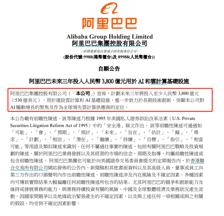 2025年2月24日,阿里發(fā)布公告稱,計(jì)劃未來三年將投入至少3800億元,用于建設(shè)AI及云基礎(chǔ)設(shè)施建設(shè),相當(dāng)于過去十年技術(shù)投入總和。