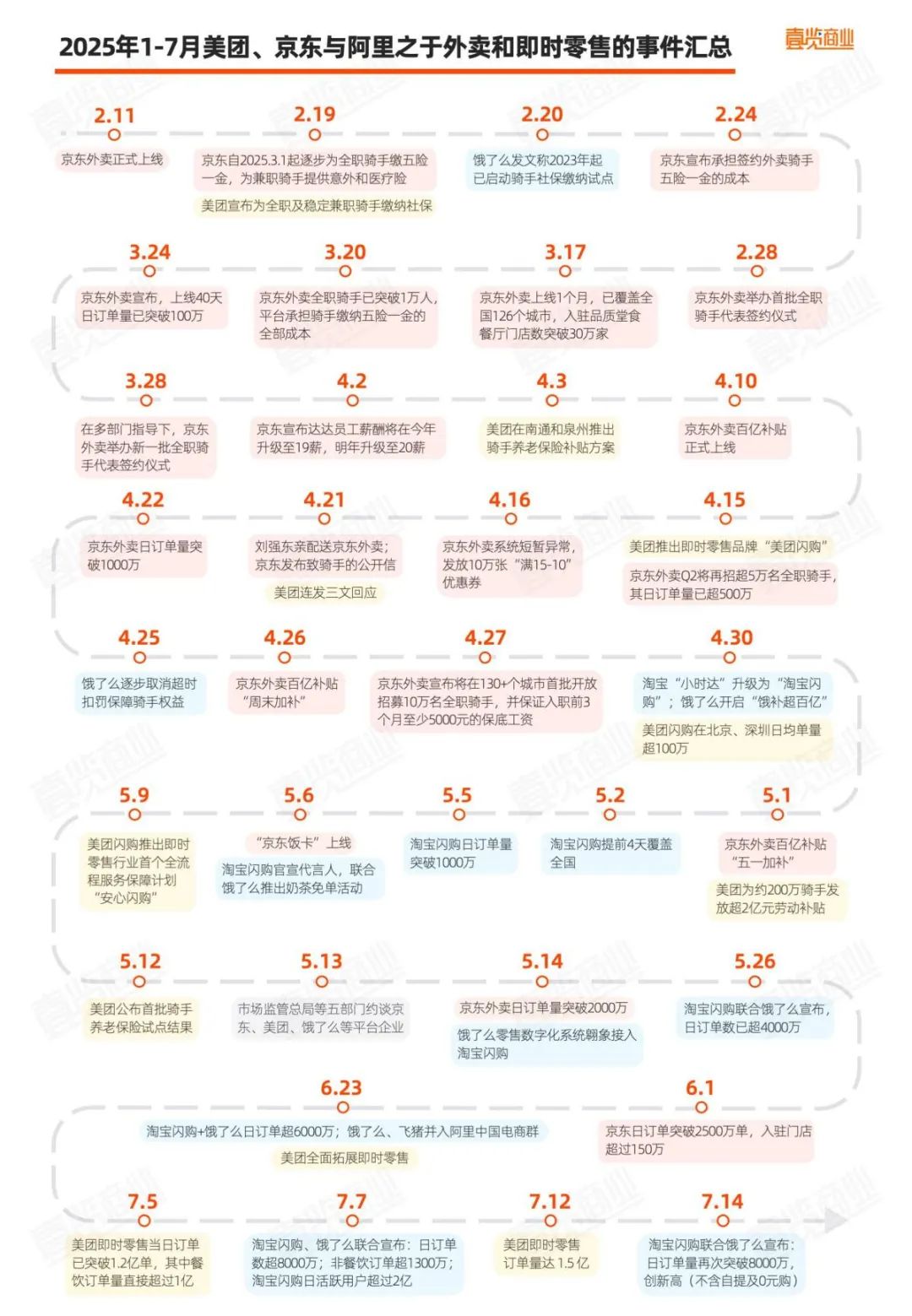 2月11日,京東上線“京東外賣”,推出百億補(bǔ)貼、免傭政策和騎手社保保障,劉強(qiáng)東親自下場(chǎng)送外賣,甚至開啟“Boss直聘”,當(dāng)場(chǎng)招攬兩位競(jìng)對(duì)的配送騎手;美團(tuán)隨即加強(qiáng)騎手權(quán)益保護(hù),并于4月15日推出即時(shí)零售品牌“美團(tuán)閃購(gòu)”應(yīng)戰(zhàn);在京東與美團(tuán)夾擊之下,阿里也于4月30日將“小時(shí)達(dá)”升級(jí)為“淘寶閃購(gòu)”,外賣市場(chǎng)“三國(guó)殺”格局正式形成。