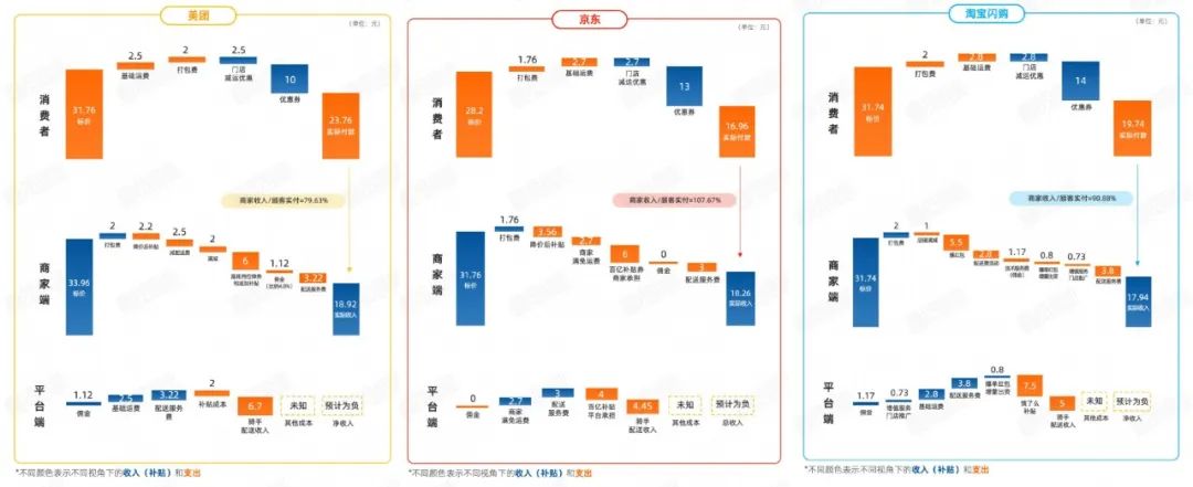 從商家端看,美團(tuán)商家實(shí)際收入最高,京東次之,淘寶閃購(gòu)最低。值得注意的是,京東平臺(tái)商家收入甚至高于消費(fèi)者支付價(jià),凸顯京東對(duì)商家的強(qiáng)力補(bǔ)貼。