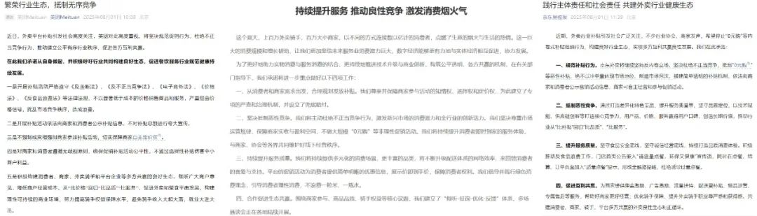 今日上午,美團(tuán)、淘寶閃購(gòu)、京東外賣先后發(fā)文,共同強(qiáng)調(diào)不以顯著低于成本的價(jià)格銷售商品和服務(wù),并堅(jiān)決抵制惡性競(jìng)爭(zhēng)。