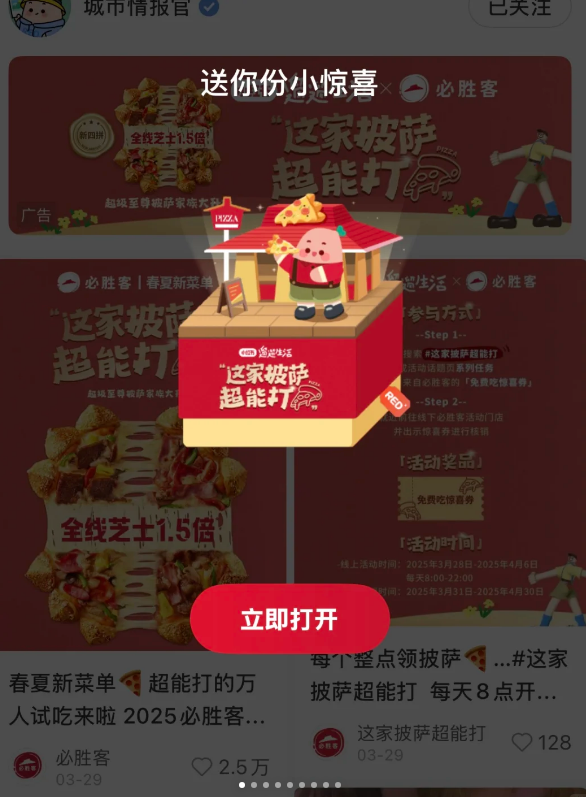 首先,必勝客聯(lián)動知名IP“遛遛生活節(jié)”,通過開屏、話題、品牌專區(qū)等渠道,精準(zhǔn)觸達年輕消費者。同時,必勝客聯(lián)合小紅書發(fā)布到店打卡任務(wù),激發(fā)消費者完成線上任務(wù)、領(lǐng)取必勝客新品券,引流到店核銷、體驗產(chǎn)品并發(fā)布UGC內(nèi)容,促進二次傳播。