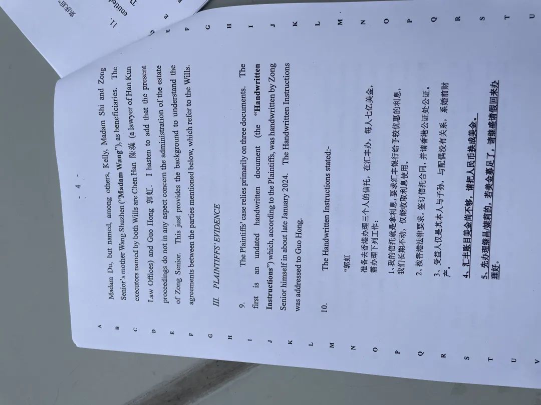 其中一份涉及宗慶后的特定離岸資產(chǎn),但未涵蓋建浩公司及其資產(chǎn);另一份涉及他在中國內(nèi)地的在岸資產(chǎn)。該等遺囑沒有將任何原告或杜女士(杜建英)列為受益人,但將宗馥莉、施幼珍及宗慶后的母親王樹珍女士等列為受益人。兩份遺囑均指定陳漢(漢坤律師事務(wù)所律師)及郭虹為遺囑執(zhí)行人。