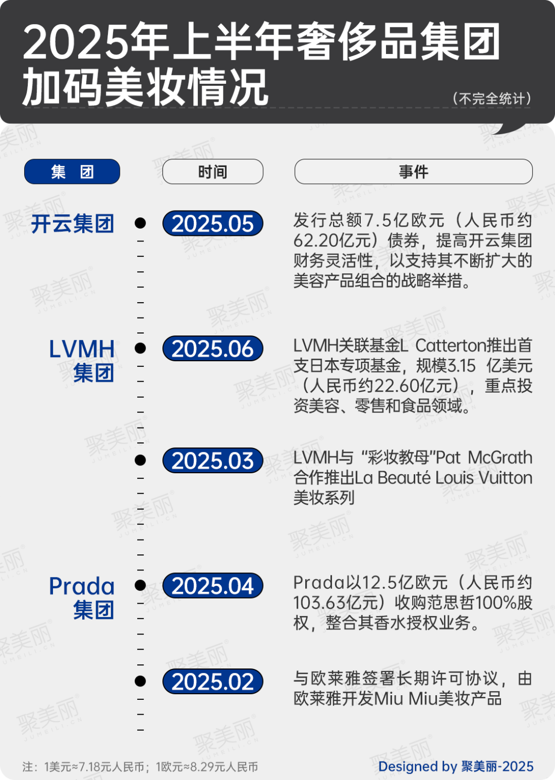 主場持續(xù)落敗的奢侈品巨頭們,自是明白奢侈品美妝存在著一定機遇,因此其也在不斷加碼、挖掘美妝市場。如下圖所示,據(jù)聚美麗不完全統(tǒng)計2025年至今不少奢侈品集團們都有加碼美妝行業(yè)的舉動。