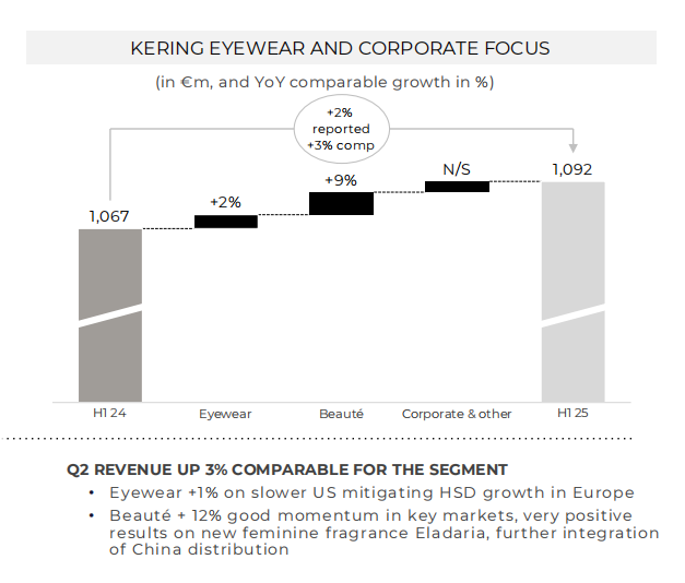 具體來看,今年上半年,開云眼鏡和企業(yè)部門(包括開云美妝)的總收入為11億歐元(人民幣約91.23億元),按報告增長2%,按可比增長3%。