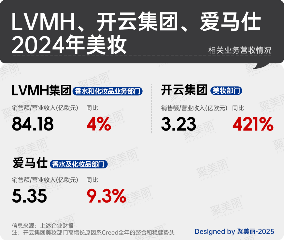 在被稱為最難一年的2024年,聚美麗在《知名奢侈品巨頭美妝部門大漲421%》一文中,針對各個奢侈品集團的業(yè)績進行了分析,彼時,美妝線多呈增長。
