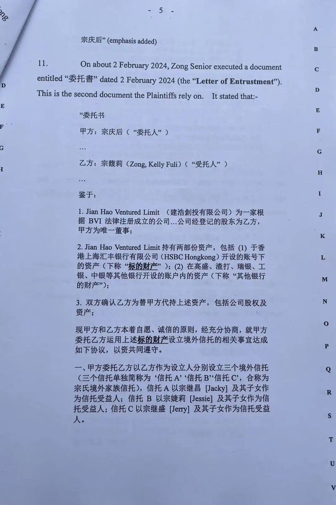 同在2024年2月2日,宗慶后簽署了一份委托書,確認(rèn)宗馥莉替宗慶后代持建浩公司股權(quán)及資產(chǎn),包括于香港上海匯豐銀行有限公司開設(shè)賬號下的資產(chǎn)(即本次訴訟的標(biāo)的資產(chǎn)),以及在其他銀行的財產(chǎn)。