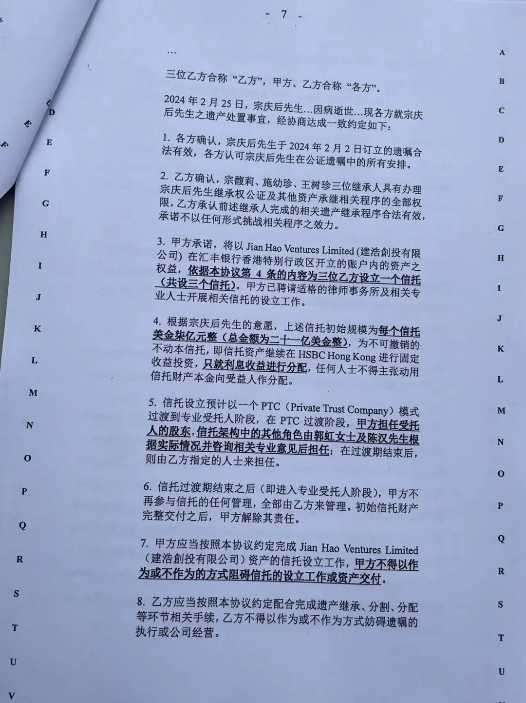 4、2024年3月14日,宗馥莉與宗繼昌、宗婕莉、宗繼盛三人就宗慶后去世引發(fā)的事宜訂立了一份名為《協(xié)議》的文件。
