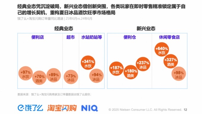 近日,淘寶閃購、餓了么聯(lián)合尼爾森IQ共同發(fā)布的《2025夏季即時零售冰品酒飲消費洞察報告》顯示,2025年6月相比5月,即時零售渠道冰品酒飲零售額環(huán)比增長41%,明顯高于全渠道(+12%)。