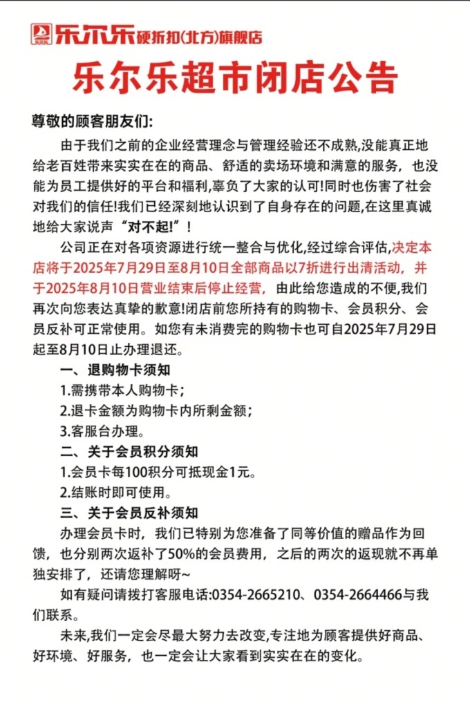 樂爾樂稱,由于之前的企業(yè)經(jīng)營理念與管理經(jīng)驗(yàn)還不成熟,沒能真正地給老百姓帶來實(shí)實(shí)在在的商品、舒適的賣場環(huán)境和滿意的服務(wù),也沒能為員工提供好的平臺(tái)和福利,辜負(fù)了大家的認(rèn)可,已經(jīng)深刻地認(rèn)識(shí)到了自身存在的問題。