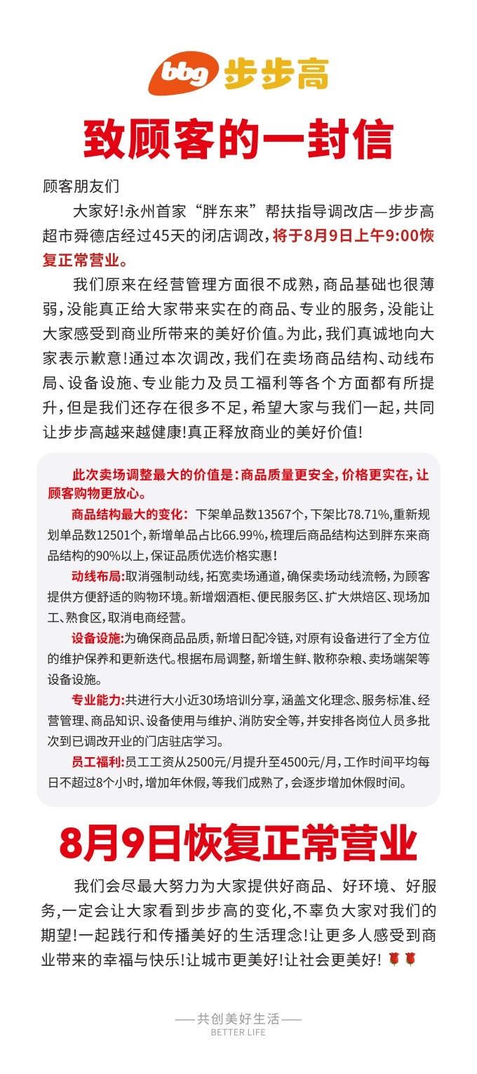 8月5日,從步步高超市獲悉,45天的閉店調(diào)改,永州首家由“胖東來”幫扶指導(dǎo)的調(diào)改店——步步高超市舜德店,將于8月9日恢復(fù)正常營業(yè)。