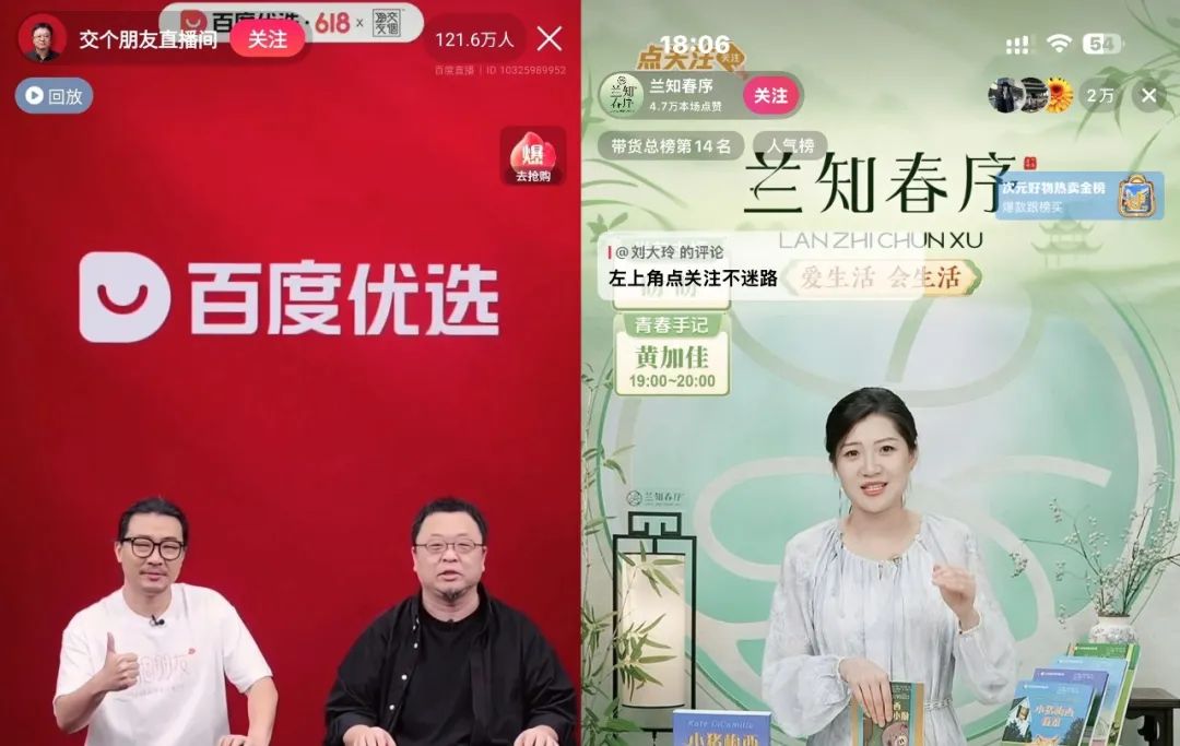 圖源:左圖截自交個(gè)朋友直播間、右圖截自與輝同行旗下直播間