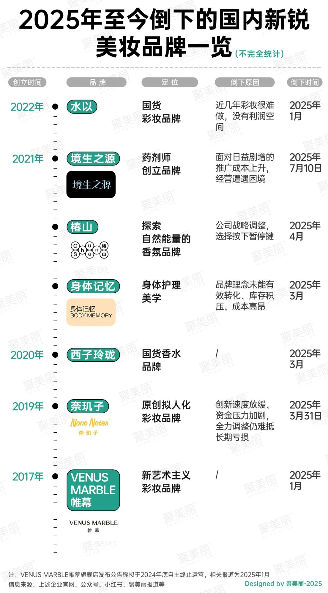 當(dāng)然,由于國(guó)內(nèi)社媒發(fā)展迅速,這一點(diǎn)對(duì)于國(guó)內(nèi)新銳美妝品牌的考驗(yàn)會(huì)更大一些,據(jù)上圖不完全統(tǒng)計(jì),僅今年上半年倒下的美妝品牌便有7個(gè)。