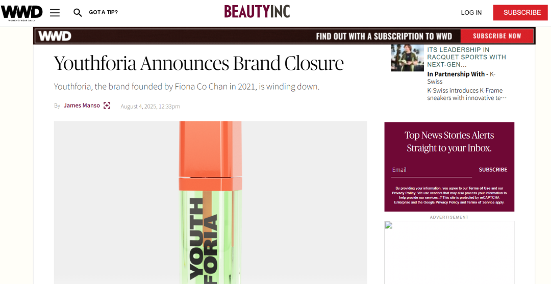 8月4日,WWD報(bào)道定位純凈美妝賽道的DTC美妝品牌Youthforia即將關(guān)閉,該品牌創(chuàng)始人兼首席執(zhí)行官Fiona Co Chan通過(guò)InstagramStory宣布了這個(gè)消息:“關(guān)閉Youthforia是一個(gè)非常艱難的決定。而創(chuàng)立小企業(yè)、經(jīng)營(yíng)小企業(yè)到最后決定結(jié)束,每個(gè)階段都充滿不同維度的挑戰(zhàn)。”
