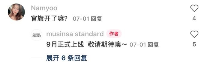 《聯(lián)商網(wǎng)》查閱發(fā)現(xiàn),MUSINSA以及Musinsa Standard目前都已入駐小紅書,根據(jù)Musinsa Standard在筆記評論區(qū)互動顯示,9月Musinsa Standard官方旗艦店將正式上線。