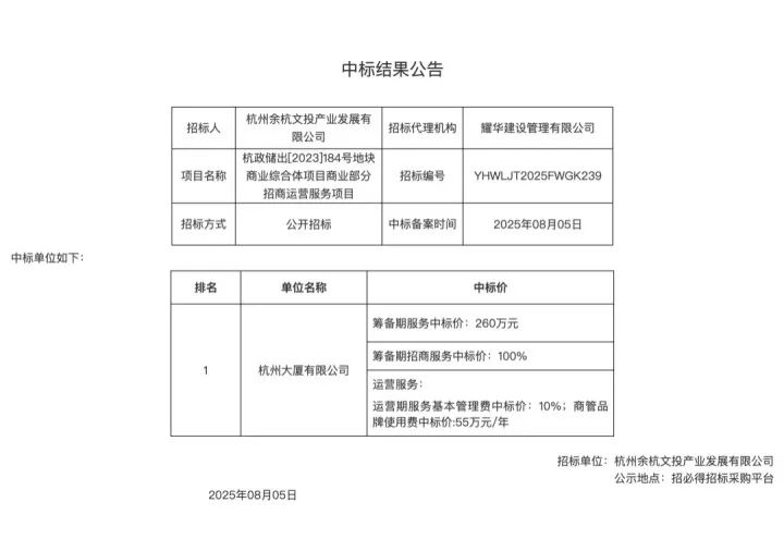 8月5日,杭州大廈有限公司中標(biāo)余杭區(qū)文一西路地鐵站商業(yè)綜合體商場運(yùn)營服務(wù)項(xiàng)目。項(xiàng)目中標(biāo)價(jià)為260萬元,運(yùn)營期管理服務(wù)費(fèi)率為10%,品牌使用費(fèi)為每年55萬元。