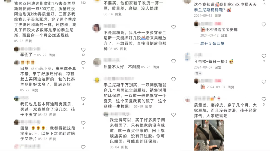 “質(zhì)量差,不耐磨”“沒(méi)有防滑,孩子經(jīng)常摔倒”“穿幾個(gè)月就脫膠”“穿一個(gè)月必爛還脫線”……去年以來(lái),關(guān)于泰蘭尼斯鞋子的避雷帖逐漸充斥社交平臺(tái),并引發(fā)“貴婦們?yōu)槭裁丛絹?lái)越不愛(ài)泰蘭尼斯”等話題熱議。