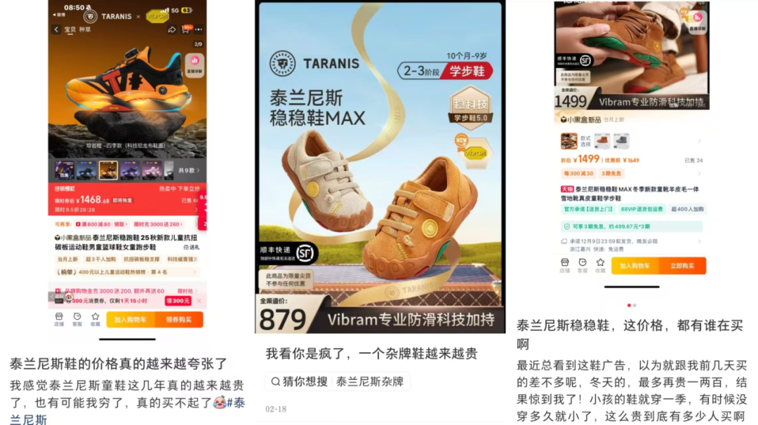 在不少老顧客眼中,以前的泰蘭尼斯童鞋對(duì)孩子來(lái)說(shuō)穿著舒適,不管鞋楦寬度還是材質(zhì)用料都有出挑之處。同時(shí),彼時(shí)的泰蘭尼斯還算平價(jià)之選,平均一雙價(jià)格在200-300元左右,折扣情況下還能更低,與其他童鞋品牌如江博士、基諾浦等幾乎在同一檔次。