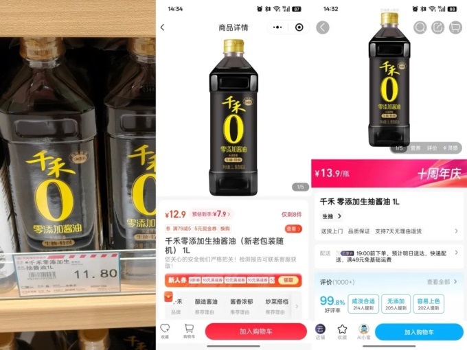 還有大旺城生活超市的千禾零添加生抽醬油1L裝售價11.8元,同款商品在永輝生活上標價為12.9元,在盒馬的非會員價(自營明日達品類)也要13.9元。