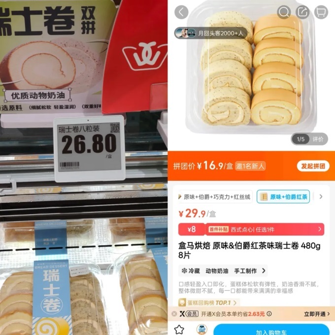 另外,在自營品類方面,盒馬烘焙的原味&伯爵紅茶味瑞士卷480克8片一盒售價29.9元,同樣使用優(yōu)質(zhì)動物奶油、大旺城的瑞士卷原味&紅茶伯爵8片裝560克售價只要26.8元。