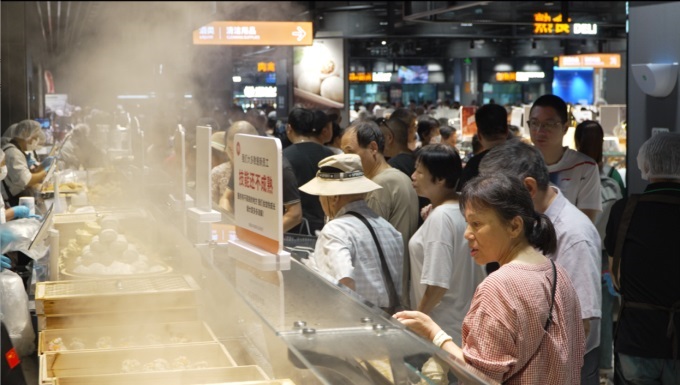 走進煥然一新的賣場,濃厚的“福州味道”撲面而來。在熟食區(qū),手工包點師傅現(xiàn)場揉捏面團,后腿肉餡料飽滿的“東部辦公區(qū)網(wǎng)紅肉包”熱氣蒸騰;福州特色撈化檔口陳列著豬雜、鮮切牛肉,還原地道湯粉風味;非遺米糕、脆皮燒肉、溫氏手撕雞等傳統(tǒng)美食沿襲地域工藝,讓賣場更添煙火氣。