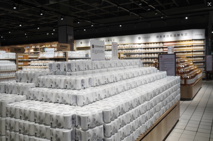 在品質(zhì)升級層面,門店專門設立了胖東來自有品牌專區(qū),集中展示DL精釀啤酒、DL燕麥片、DL復合果汁、DL自由愛白酒等爆火單品;同步打造永輝自有品牌矩陣,涵蓋洗衣液、黑松露餅干等生活剛需品。