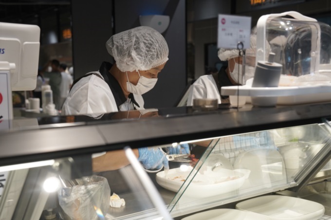 在果切區(qū),新增的冷萃茶與廣西酸野令人眼前一亮,每盒果切標注甜度編號,提示牌盡顯巧思;蔬菜區(qū)的有機菜苗嫩葉帶露,閩北高山空心菜與花青素紫甘藍組成“健康方陣”,12款定向種植蔬菜的溯源二維碼隨指尖輕掃呈現(xiàn)生長歷程;海鮮區(qū)宛如微型漁市,帝王蟹、波龍、面包蟹、珍寶蟹組成“進口四大金剛”,創(chuàng)新的“海鮮廚房”提供代加工服務解決家庭烹飪難題,“現(xiàn)殺現(xiàn)切+現(xiàn)場烹煮”的服務模式成為一大亮點,充分契合福州消費者對生猛海鮮和便捷加工的高頻需求。