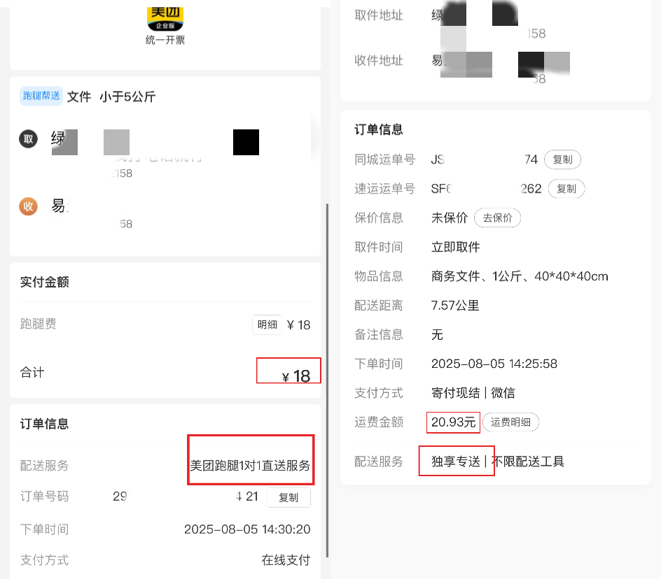 在取送距離、物品類型完全相同,且均為“一對一專人配送”的前提下,順豐同城的價格為20.93元,美團(tuán)跑腿則為18元,順豐報價高出約3元。
