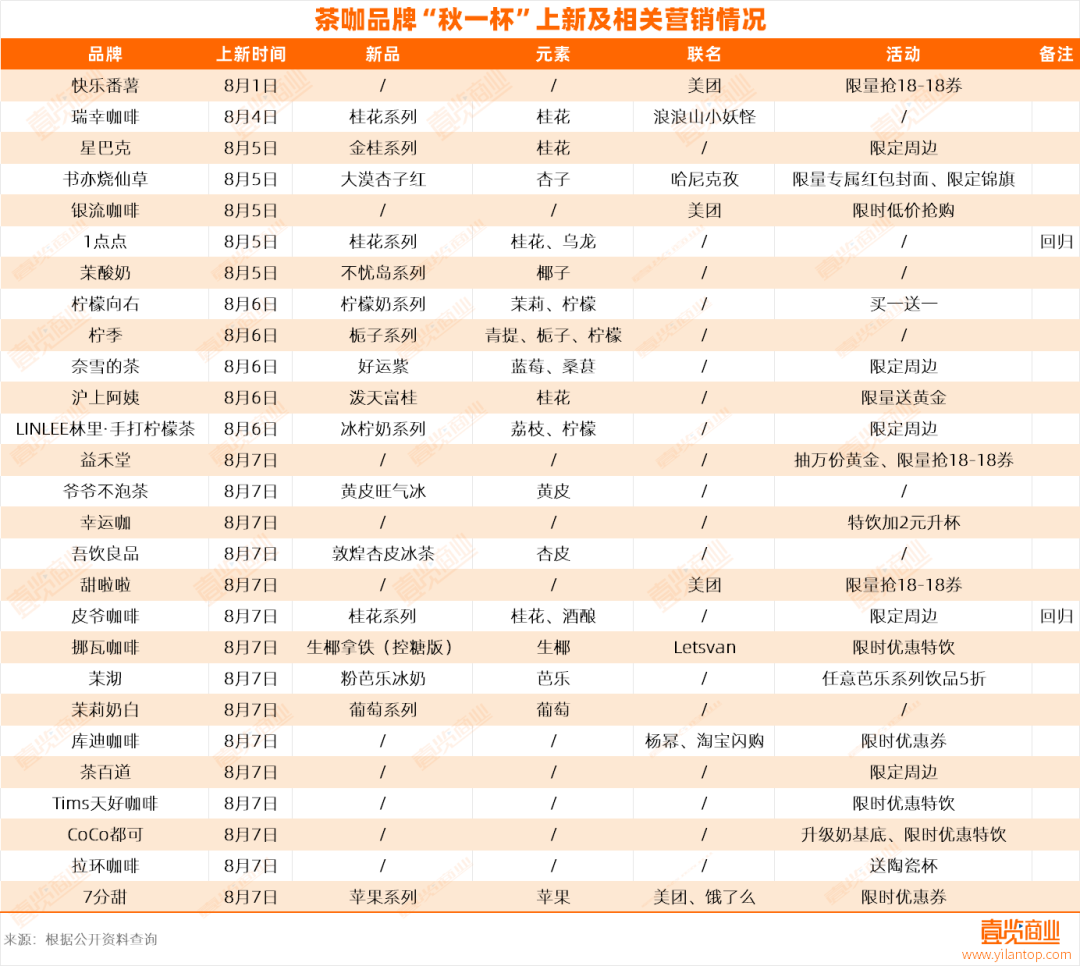 據(jù)茶咖觀察不完全統(tǒng)計,今年秋季至少有28個茶咖品牌發(fā)起“秋一杯”主題活動,其中19個品牌共推出33款新品,含4款回歸產(chǎn)品。