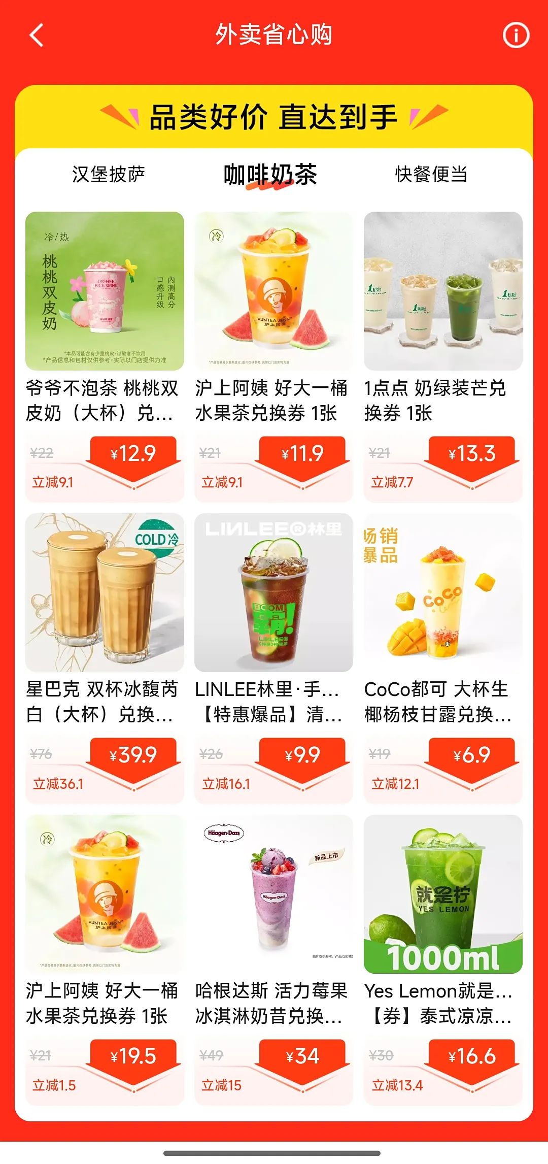 從頁(yè)面看,主要聚焦在漢堡披薩、咖啡奶茶、快餐便當(dāng)這些常見品類。