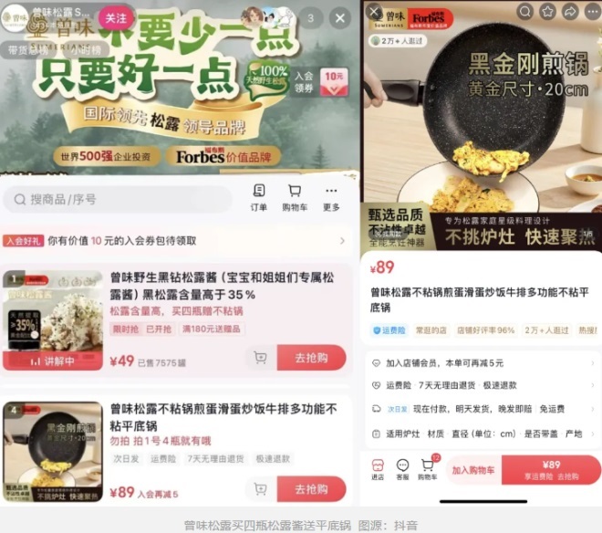 另一方面,贈品反過來增加了產(chǎn)品的使用頻次、拓寬了產(chǎn)品的使用思路,甚至不局限于搭配本產(chǎn)品,還能滿足其他需求,比如曾味購買松露醬送平底鍋,除了直播間教你可以用來炒松露飯以外,還能用來煎牛排、滑蛋等等。