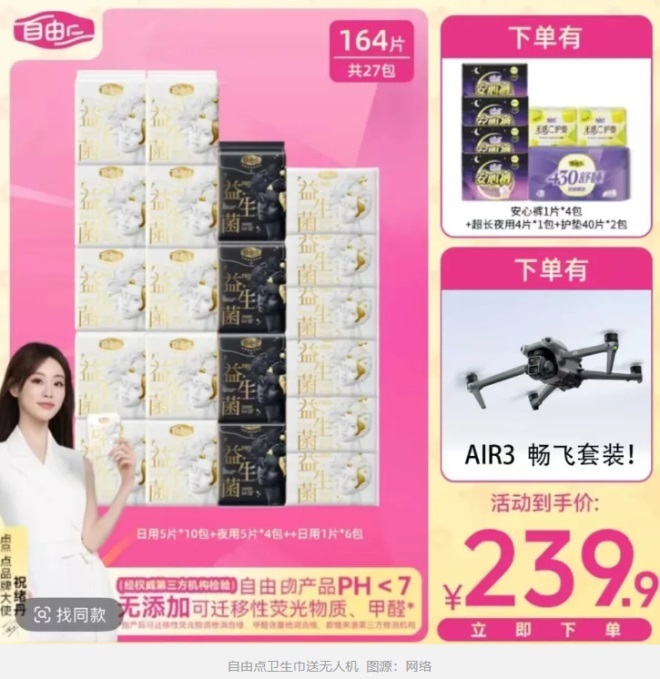 且無論是無人機(jī)、運動相機(jī),還是滑板車,這些贈品均貼合了當(dāng)下互聯(lián)網(wǎng)的熱門話題,再加上衛(wèi)生巾本就屬于日常囤貨的剛需產(chǎn)品,噱頭贈品又滿足了消費者的興趣、增添了消費者獲得感,在這種情況下,消費者很難不會在“最后二十單”中上頭下單。