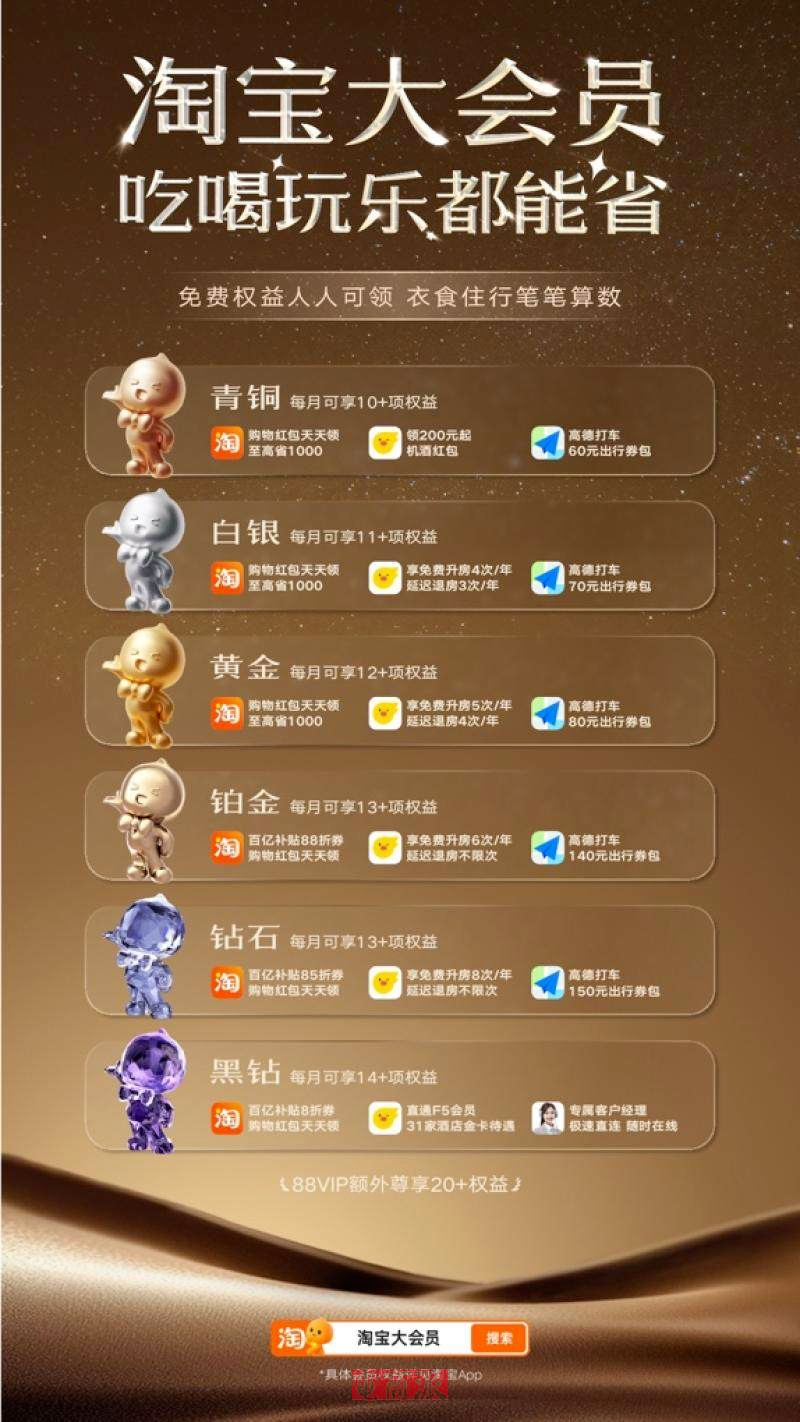 近日,淘寶上線(xiàn)全新大會(huì)員體系,打通餓了么、飛豬、盒馬、高德等阿里系資源,新體系整合購(gòu)物、外賣(mài)、旅行、出行等多元化權(quán)益,覆蓋吃喝玩樂(lè)、衣食住行。同時(shí),88VIP用戶(hù)權(quán)益將全面升級(jí)。