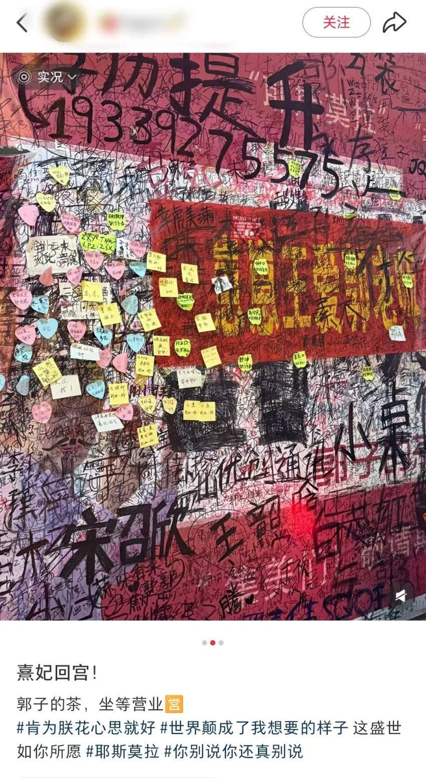 據(jù)紅餐網(wǎng)了解,該門(mén)店還在圍擋期間,網(wǎng)紅郭老師就開(kāi)始現(xiàn)身店外為即將開(kāi)出的新店“站臺(tái)”,導(dǎo)致門(mén)店直接未開(kāi)先火。期間,還有不少網(wǎng)友發(fā)帖,該店外的留言板密密麻麻地都是專(zhuān)門(mén)到店打卡的網(wǎng)友們的手寫(xiě)留言,門(mén)店也被網(wǎng)友戲稱(chēng)為“滄州新晉5A級(jí)景區(qū)”。僅幾天時(shí)間,“郭子的茶”在大眾點(diǎn)評(píng)的評(píng)論數(shù)就曾一度高達(dá)近兩千。