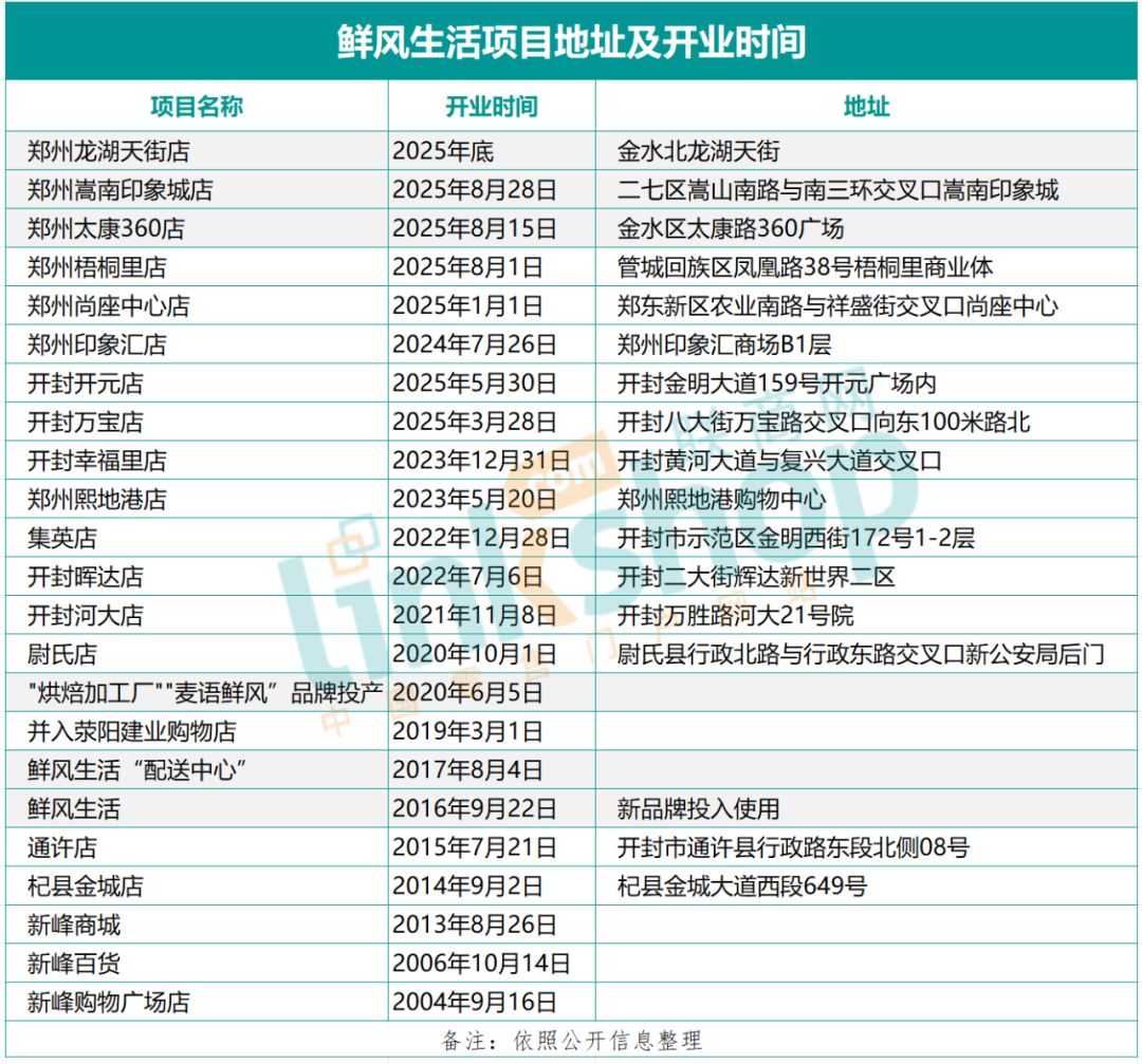 資料顯示,鮮風(fēng)生活成立于2004年,總部位于河南開封,前身名叫“新峰”。2004年9月,第一家店“新峰購物廣場”在開封杞縣開業(yè)。經(jīng)過10年的積累,2014年9月,第一家生鮮加強型的社區(qū)超市“金城店”開業(yè),該社區(qū)型超市業(yè)態(tài)的打造,在當(dāng)時已領(lǐng)先行業(yè)5年。