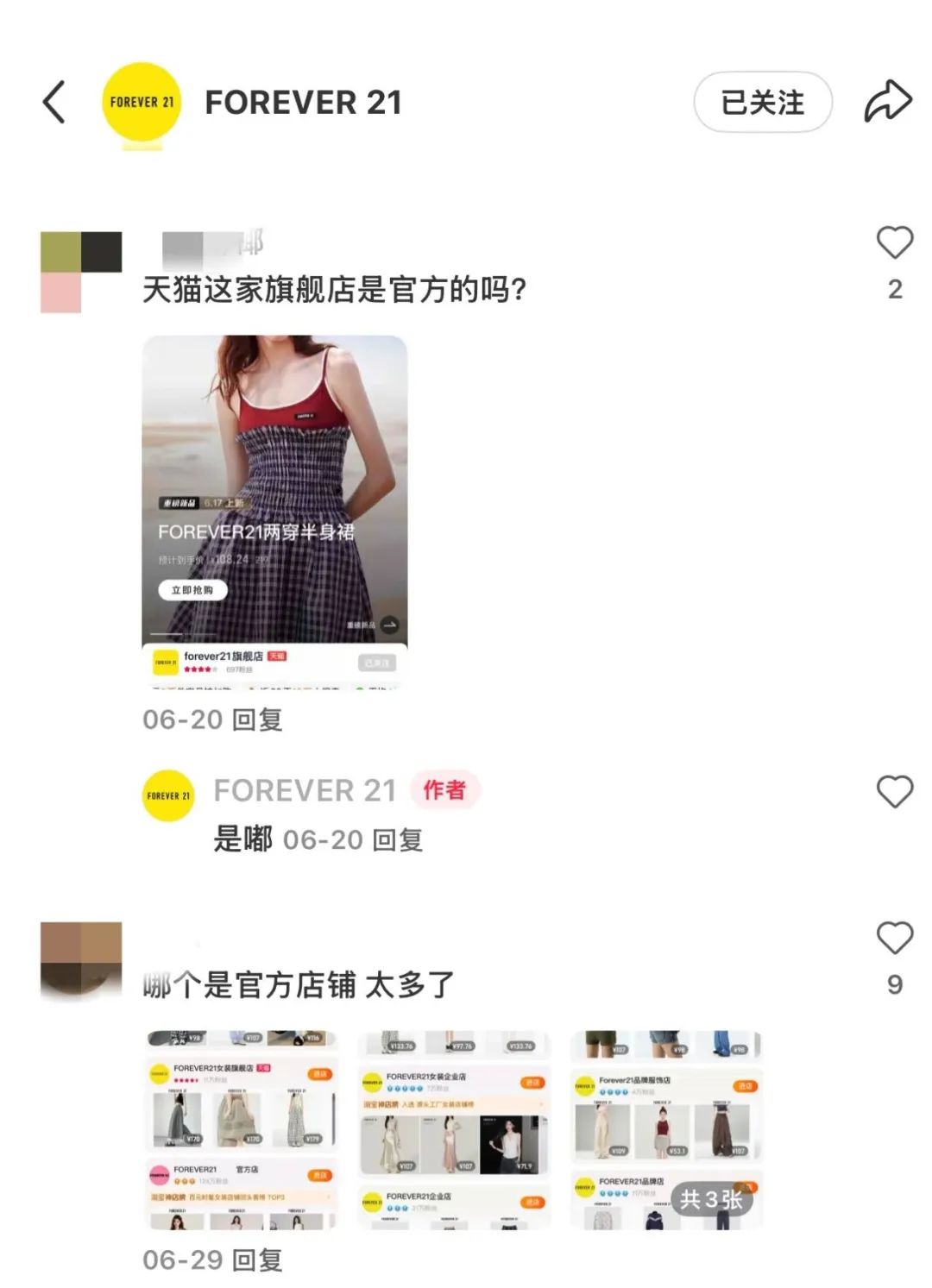 事實(shí)上,在中國(guó)市場(chǎng)「快進(jìn)快出」一定程度上損害了Forever 21的品牌形象。比如在Forever 21官宣入駐小紅書的評(píng)論中,消費(fèi)者更關(guān)心哪個(gè)是官方店鋪?