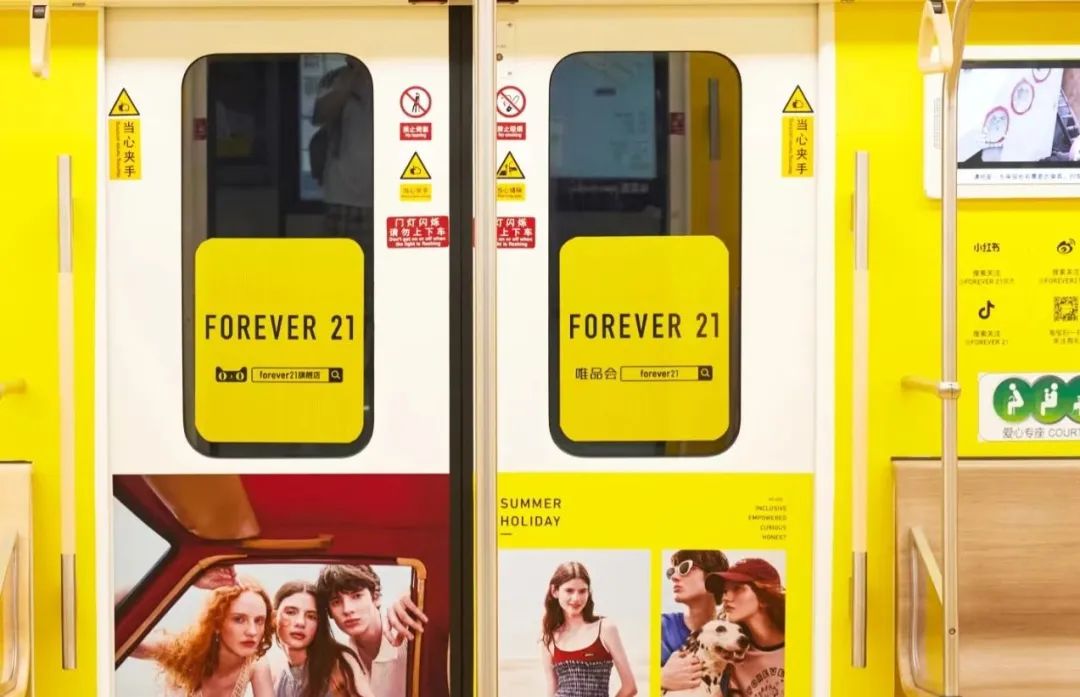 6月30日,上海宏伊國(guó)際廣場(chǎng)、杭州湖濱銀泰in77、武漢武商MALL三城大屏聯(lián)動(dòng);7月1日開始到7月14日,F(xiàn)orever 21在上海地鐵18號(hào)線打造「Forever 21專列」,線上線下全方位宣布自己回歸。