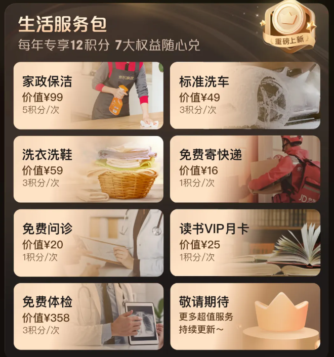 比如上新了可以用少量積分兌換大額服務(wù)的權(quán)益,如生活服務(wù)包,包括5積分兌換價值99元的家政保潔服務(wù)、3積分兌換價值49元的標準洗車服務(wù)等7大權(quán)益。