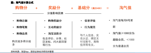國信證券一份發(fā)布于2024年的研報顯示,淘寶的淘氣值由購物分+獎勵分+基礎(chǔ)分構(gòu)成,基礎(chǔ)分滿分是400分,獎勵分靠多參與平臺互動獲得,購物分主要包括購物總額、購物筆數(shù)和購物品類,也就是購買越多得分越高。