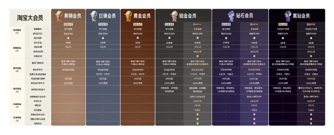 例如從青銅到黃金等級的會員在淘寶中獲得的權(quán)益都相同,在飛豬中各項權(quán)益的數(shù)值有小幅變化。