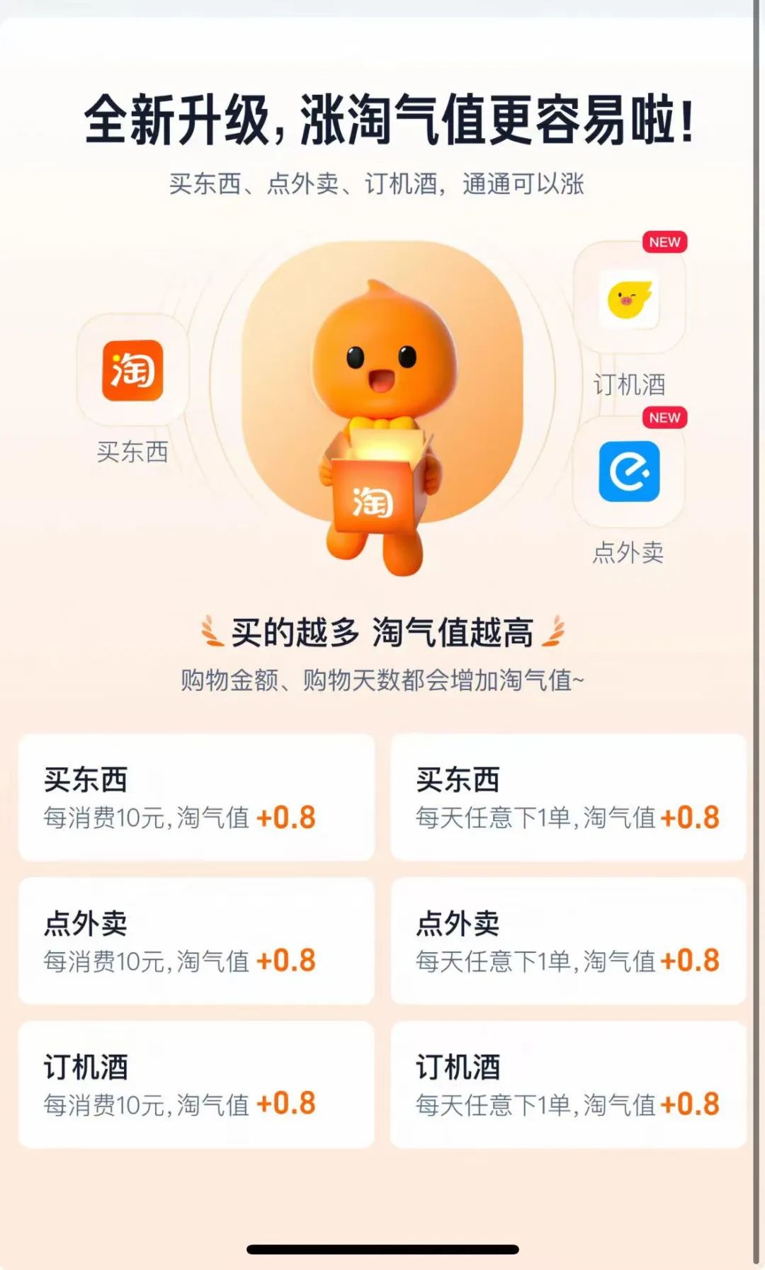 按這樣的計算方式以及各平臺的屬性來看,單筆消費金額較高的淘寶、飛豬,是提升消費金額淘氣值的主力,單筆消費金額較低的餓了么則是刺激用戶通過每天下單,提升淘氣值的主力。
