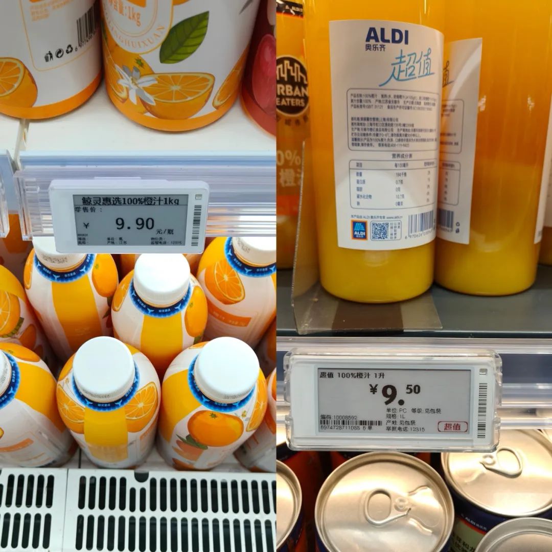 值得關(guān)注的是,“鯨靈惠選”采用白底藍(lán)字外包裝設(shè)計(jì),部分商品標(biāo)注“勁省”“超值”等字樣,與奧樂(lè)齊自營(yíng)超值商品系列在視覺(jué)傳達(dá)與價(jià)值主張上高度契合,體現(xiàn)出對(duì)成熟硬折扣模式的借鑒。