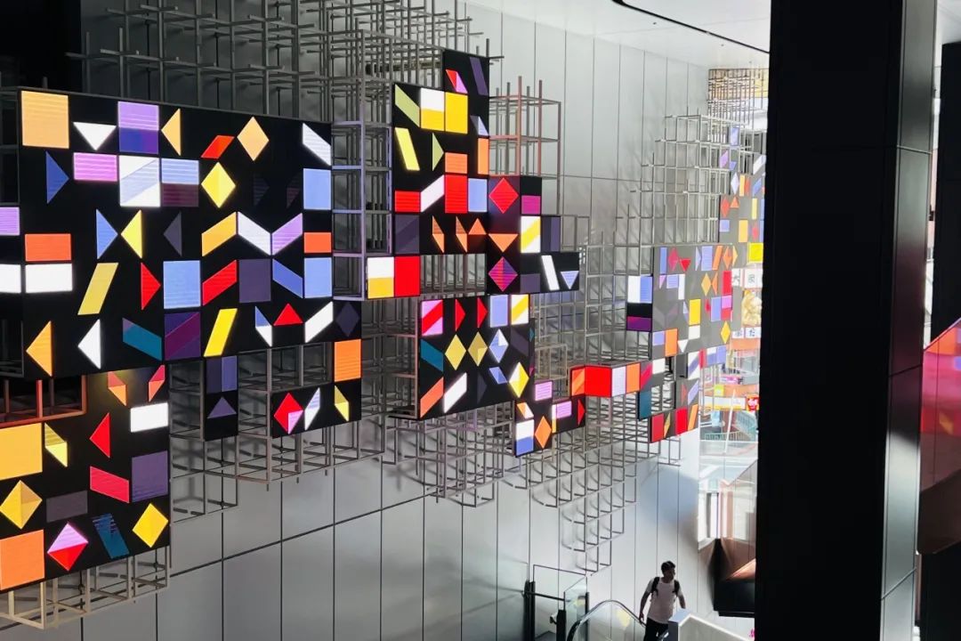 當(dāng)大眾要從澀谷站穿梭至戶外,首先經(jīng)過的便是ときめきSTAGE(心跳舞臺(tái))的扶梯。這個(gè)大型中庭的特色之一便是由墻面上馬賽克般網(wǎng)格元素組成的圖案,在LED燈光和影像的營造下不斷變化著視覺氛圍。