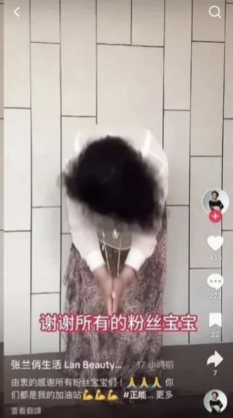 對此,張?zhí)m并不氣餒,又轉(zhuǎn)戰(zhàn)TikTok,使用賬號“張?zhí)m俏生活Lan Beauty Life”直播,并向粉絲朋友們鞠躬致謝。