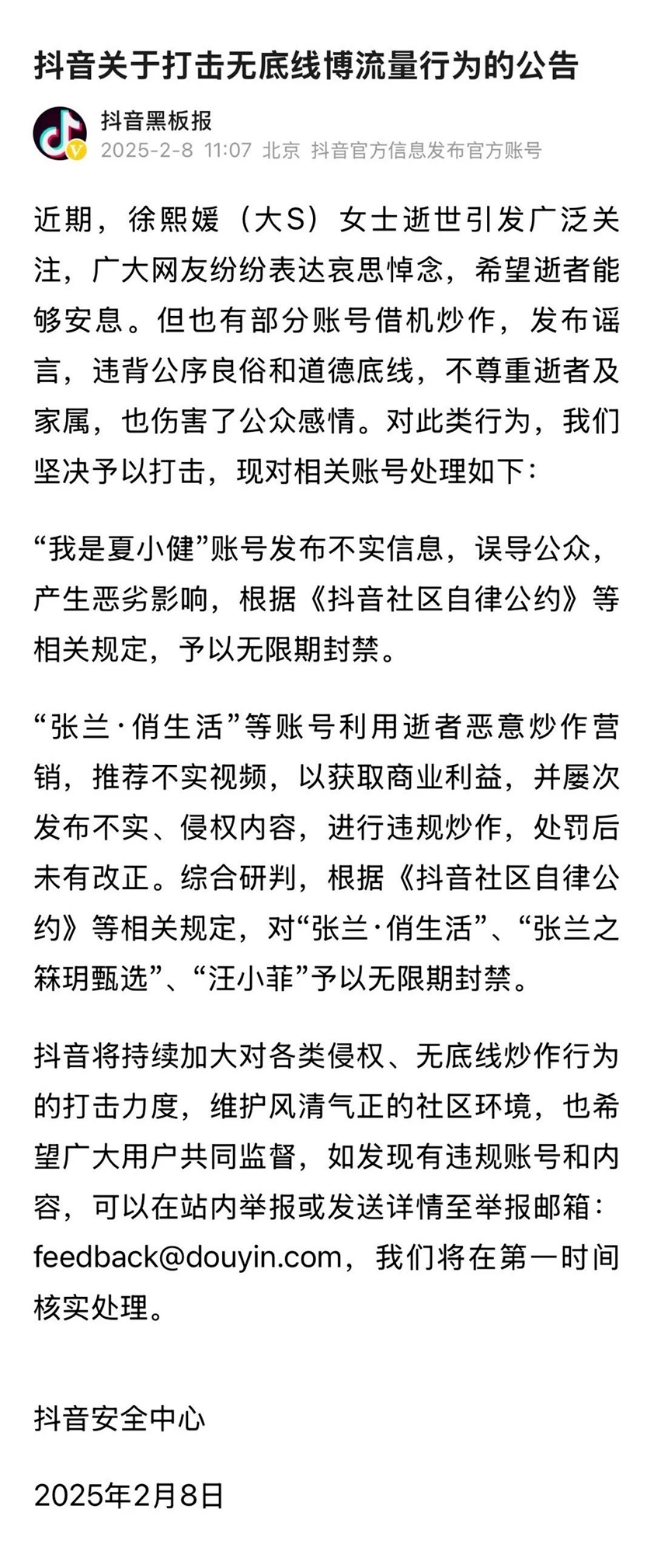 今年2月,大S因流感并發(fā)肺炎去世,而張?zhí)m和汪小菲也借此制造話題,博取了大量關(guān)注和流量。于是,張?zhí)m和汪小菲的抖音賬號便被平臺無限期封禁了。具體來看,抖音官方發(fā)布公告稱,“‘張?zhí)m·俏生活’等賬號利用逝者惡意炒作營銷,推薦不實視頻,以獲取商業(yè)利益,并屢次發(fā)布不實、侵權(quán)內(nèi)容,進行違規(guī)炒作,處罰后未有改正。綜合研判,根據(jù)《抖音社區(qū)自律公約》等相關(guān)規(guī)定,對‘張?zhí)m·俏生活’、‘張?zhí)m之稱玥甄選’、‘汪小菲’予以無限期封禁!