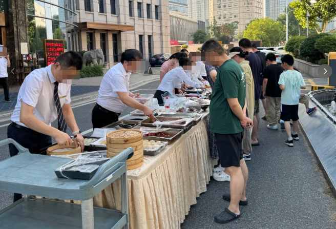 這股熱潮最新鮮的注腳,當(dāng)屬高端酒店的“下沉式”擺攤。上海的金陵紫金山大酒店、中建萬怡酒店,浙江的浙江大酒店、望湖賓館,河南的永和鉑爵國際酒店、大河錦江酒店等,從一線城市到三、四線小城,酒店外擺售賣鹵味、快餐已成為一股新潮流。